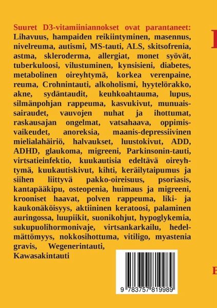 Uskomaton D3-vitamiini parantaa useimmat sairaudet kun sitä käytetään suurina annoksina. Samalla on käytettävä K2-vitamiinia, magnesiumia, sinkkiä ja booria puutosten välttämiseksi. Tämä on Bowlesin toinen D3-vitamiinikirja, jota on täydennetty lähes 10 vuoden kokemuksilla suurten D3-vitamiiniannosten käytöstä ja siinä tarvittavista muista lisäravinteista. D3-vitamiini käynnistää kehon uusiutumisen ja kohdistaa immuunijärjestelmän ulkoisiin uhkiin sekä suojaa oman kehon autoimmuunisairauksilta. D3-vitamiinin kyky parantaa suurin osa pitkäaikaisistakin sairauksista muuttaa radikaalisti käsityksen ihmisen omasta kyvystä toipua, kun siihen annetaan mahdollisuus. Lääkäreiden osaaminen D3-vitamiinin puutostaudeista on pääsääntöisesti heikko ja hyvin yleinen pelko D3-vitamiinin myrkyllisyydestä on perusteeton. Omasta terveydestä on mahdollista ottaa vastuu, kun moniin sairauksiin on saatavissa apu perinteisen lääketieteen unohtamalta alueelta.