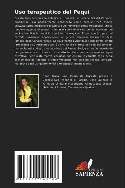 Questo libro presenta la botanica e i possibili usi terapeutici del Caryocar brasiliense, più popolarmente conosciuto come "pequi". Può essere utilizzata come medicinale grazie ai suoi numerosi effetti terapeutici, che la rendono oggetto di grandi ricerche e sperimentazioni per la ricchezza dei suoi nutrienti e le possibili azioni farmacologiche. È una specie tipica del cerrado brasiliano, appartenente al genere Caryocar brasiliense della famiglia delle Caryocaraceae. Gli studi hanno evidenziato i suoi diversi effetti farmacologici su varie malattie. È un frutto che si trova non solo nel cerrado, ma anche nel sud-est e nel nord-est del Paese. Svolge un ruolo importante nel generare posti di lavoro e reddito familiare per la popolazione agro-estrattiva. Per questo motivo, chiunque può entrare in contatto con il pequi al momento del raccolto e trarre vantaggio non solo dal reddito familiare, ma anche dagli usi gastronomici e terapeutici. Buona lettura!
