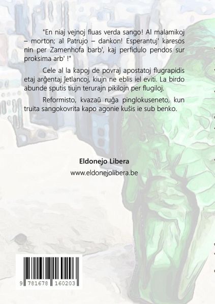 2 originalaj, satiraj scienc-fikciaj noveloj. "En niaj vejnoj fluas verda sango! Al malamikoj - morton; al Patrujo - dankon! Esperantuj' karesos nin per Zamenhofa barb', kaj perfidulo pendos sur proksima arb' !" Cele al la kapoj de povraj apostatoj flugrapidis etaj ar¿entaj ¿etlancoj, kiujn ne eblis iel eviti. La birdo abunde sputis tiujn terurajn pikilojn per flugiloj. Reformisto, kvazä rüa pinglokuseneto, kun truita sangokovrita kapo agonie küis ie sub benko.