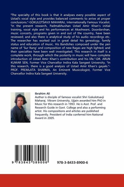 "The specialty of this book is that it analyses every possible aspect of Ustad's vocal style and provides balanced comments to arrive at proper conclusions."-GOKULOTSAVJI MAHARAJ, Internationally Famous Vocalist. "In the present research, Padmabhushan Ustad Amir Khan's initial training, vocal style and his performances at Akashwani, Doordarshan, music concerts, programs given in and out of the country, have been reviewed; and also there is analytical study of his audio recordings etc. The researcher has worked out in great detail his genealogy, family status and education of music. His Bandishes composed under the pen name of Sur Rang' and composition of new Ragas are high lighted; and their specialties have been well investigated. This research in itself is a complete work, through which the posterity in music will have complete introduction of Ustad Amir Khan's contribution and his life."-DR. ARUN KUMAR SEN, Former Vice Chancellor Indira Kala Sangeet University. "In this research, there is a good analysis of Ustad Amir Khan's gayaki."-PROF. PREMLATA SHARMA, An Eminent Musicologist, Former Vice Chancellor Indira Kala Sangeet University.