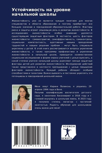 Zhiznestojkost' uzhe ne qwlqetsq chuzhdym ponqtiem dlq mnogih specialistow w oblasti obrazowaniq i poätomu priobretaet wse bol'shee znachenie w powsednewnoj obrazowatel'noj rabote. Faktory riska i zaschity igraüt reshaüschuü rol' w razwitii zhiznestojkosti. V issledowaniqh zhiznestojkosti osoboe wnimanie udelqetsq suschestwuüschim zaschitnym faktoram. V chastnosti, shest' faktorow zhiznestojkosti - samowospriqtie, samoäffektiwnost', samokontrol', social'naq kompetentnost', adaptiwnye nawyki preodoleniq trudnostej i nawyki resheniq problem - mogut byt' special'no ukrepleny u detej. V ätoj knige rassmatriwaütsq woprosy ukrepleniq zhiznestojkosti, a takzhe programmy profilaktiki i ukrepleniq zhiznestojkosti w nachal'noj shkole, prowoditsq kolichestwennoe social'noe issledowanie w forme oprosa uchitelej s cel'ü wyqsnit', w kakoj stepeni uchitelq nachal'noj shkoly ukreplqüt lichnye zaschitnye faktory detej dlq razwitiq zhiznestojkosti. Issledowanie dejstwij takzhe predstawleno w kontexte prepodawaniq s cel'ü powysheniq faktorow zhiznestojkosti. Kazhdyj rebenok obladaet osobymi sposobnostqmi i talantami. Vazhno wyqwlqt' i postoqnno ukreplqt' äti potencialy w powsednewnoj shkol'noj zhizni.