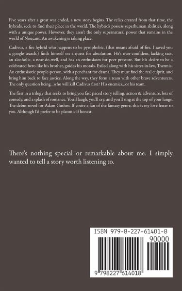 Five years after a great war ended, a new story begins. The relics created from that time, the hybrids, seek to find their place in the world. The hybrids possess superhuman abilities, along with a unique power. However, they aren't the only supernatural power that remains in the world of Noucant. An awakening is taking place. Cadivus, a fire hybrid who happens to be pyrophobic, (that means afraid of fire. I saved you a google search.) finds himself on a quest for absolution. He's over-confident, lacking tact, an alcoholic, a near-do-well, and has an enthusiasm for peer pressure. But his desire to be a celebrated hero like his brother, guides his morals. Exiled along with his sister-in-law, Thermia. An enthusiastic people-person, with a penchant for drama. They must find the real culprit, and bring him back to face justice. Along the way, they form a team with other brave adventurers. The only question being...who will kill Cadivus first? His enemies...or his team. The first in a trilogy that seeks to bring you fast paced story telling, action & adventure, lots of comedy, and a splash of romance. You'll laugh, you'll cry, and you'll sing at the top of your lungs. The debut novel for Adam Guthro. If you're a fan of the fantasy genre, this is my love letter to you. Although I'd prefer to be platonic if honest.