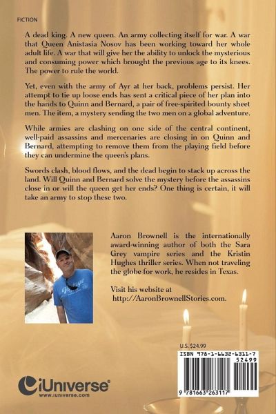 A near dystopian future just reemerging into a neo-industrial age is the framework for a tale of global power and conquest. Anistasia, the untrustworthy, scheming daughter of a long-forgotten family aches for the power of kings and queens. Aches for more than the minor power of rulers only moving kingdoms, but the power to control the world. Anistasia's plans see her worm her way into the kingdom of Ayr. As its new queen, she sets out on her quest to reclaim the awesome power that destroyed the previous age. To do this, she will need to conquer the original six kingdoms of the land and unlock the vault buried deep in the City of Bleached Bones. Accidentally finding themselves on the opposite side of the queen's plans, Quinn and Bernard stumble across Anistasia's plans while collecting a bounty sheet on a thief. The parchment they find on the thief sets the duo free spirited swordsmen off on a haphazard hunt for more information and the development of a plan to create problems for the Dread Queen of Ayr. With a host of sorceresses, assassins, and dodgy characters set in their path at every turn, just staying alive presents the two with a challenge. It's up to Quinn and Bernard to figure out the mystery presented them all while Queen Anistasia destroys the Kingdom of Neeron and marches the Ayr army father south to take on Oban, and collect her second scepter. The second scepter of the six needed to grasp ultimate power and control the world.