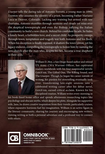 Usurper tells the daring tale of Antonio Ferretti, a young man in 1890s Trenton who assumes the identity of a priest, becoming Father Mariano Luca in Denver, Colorado. Lacking any training but armed with raw charisma, Antonio stumbles through sermons and rituals yet wins over the skeptical townspeople and even the Bishop, rallying the Italian community to build a new church. Behind his confident facade, he hides a lonely heart, a forbidden love, and a secret child. As prosperity sweeps through town, temptation and tragedy test both Antonio and his flock. When his deception is finally exposed, it shatters the town's trust, yet his legacy endures, compelling the townspeople to honor him by naming the new church after the man who, despite his lies, became a true shepherd in their eyes.