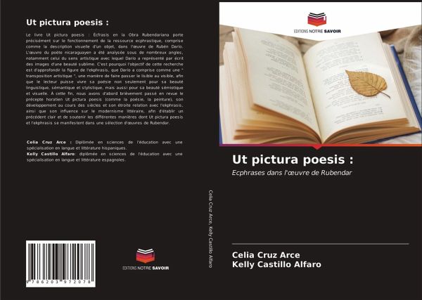 Le livre Ut pictura poesis : Écfrasis en la Obra Rubendariana porte précisément sur le fonctionnement de la ressource ecphrastique, comprise comme la description visuelle d'un objet, dans l'oeuvre de Rubén Darío. L'oeuvre du poète nicaraguayen a été analysée sous de nombreux angles, notamment celui du sens artistique avec lequel Darío a représenté par écrit des images d'une beauté sublime. C'est pourquoi l'objectif de cette recherche est d'approfondir la figure de l'ekphrasis, que Darío a comprise comme une " transposition artistique ", une manière de faire passer le lisible au visible, afin que le lecteur puisse vivre sa poésie non seulement pour sa beauté linguistique, sémantique et stylistique, mais aussi pour sa beauté sémiotique et visuelle. À cette fin, nous avons d'abord brièvement passé en revue le précepte horatien Ut pictura poesis (comme la poésie, la peinture), son développement au cours des siècles et son étroite relation avec l'ekphrasis, ainsi que son influence sur le modernisme littéraire, afin d'établir un précédent clair et de soutenir les différentes manières dont Ut pictura poesis et l'ekphrasis se manifestent dans une sélection d'oeuvres de Rubendar.