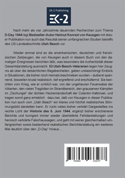 Utha Beach - Der Kilometer Null - blutig erkauft ...Normandie, 6. Juni 1944: D-Day! Die Alliierten wagen den Sturm auf die "Festung Europa". Die Landung in der Normandie gilt als eine der größten Militäroperationen der Menschheitsgeschichte. Untrennbar mit ihr verknüpft sind menschliche Tragödien, militärische Fehlschläge, schier unglaubliche Einzelschicksale und abenteuerliche Geheimnisse ...Der renommierte D-Day-Experte und Historiker Helmut Konrad Freiherr von Keusgen, bekannt aus einschlägigen Print-, Radio- und TV-Dokumentationen zum D-Day, ist weltweit geschätzt für seine in ihrer Art einzigartigen Aufarbeitung der historisch so bedeutsamen großen Invasion in der Normandie.Mit dem vorliegenden Buch "Utha Beach - Der Kilometer Null" liefert der Autor eine detaillierte Gesamtdarstellung der militärischen Operation ab, die sich an diesem Strandabschnitt zutrug, als tausende US-Soldaten und gepanzerte Fahrzeuge im Angesicht des deutschen Abwehrfeuers den Invasionsabschnitt stürmten, um die "Festung Europa" endgültig zu knacken.Profitieren Sie von der jahrzehntelangen, gründlichen Recherche des Autors. Von Keusgen hat unzählige Unterlagen und Pläne ausgewertet und mit zahllosen Veteranen beider Seiten gesprochen. Auf dieser Grundlage erarbeitete er die vermutlich umfangreichste Gesamtdarstellung über die komplexen Kampfhandlungen und die militärische Operation im US-Landeabschnitt Utha an der Küste der Normandie.Der Autor ergänzt seine Darstellungen des für beide Seiten grauenhaften Kampfes durch zahllose Berichte amerikanischer, deutscher und französischer Zeitzeugen. Ihre schonungslosen Erzählungen werden Sie direkt in die Ereignisse hineinsaugen und nicht mehr loslassen.In seinem Buch malt von Keusgen in unverhohlener Offenheit ein äußerst realistisches und höchst eindrucksvolles Bild des Krieges direkt vor Ihren Augen - ein grausames, blutiges Bild menschlicher Tragödien, Einzelschicksale und Verzweiflung. Die ausführlichen Beschreibungen der verworrenen Kampfhandlungen um eine der berühmtesten Militäroperationen im Zweiten Weltkrieg - die Landung am Utha Beach - sind wohl einmalig in der deutschen Militärliteratur. Auf dem schmalen Strandstreifen am Fuß der Halbinsel Cotentin ereigneten sich am ersten Invasionstag zahlreiche blutige Kämpfe, die zu Unrecht im Schatten anderer Invasionskämpfe stehen ...Gerade die Zeitzeugenberichte aus erster Hand lassen Sie hautnah eintauchen in die geschichtsträchtigen Ereignisse während der Landung.Was Sie von diesem Buch erwarten dürfen:Hunderte Originalfotos und Abbildungen lassen den Kampf um Utha Beach vor Ihren Augen lebendig werdenDie gebundene Ausgabe bietet zahlreiche Farbbilder; das Taschenbuch ist umweltschonend in schwarz-weiß gedruckt.Zahlreiche deutsche, französische und US-amerikanische Zeitzeugenberichte bereichern die Darstellungen des AutorsFreuen Sie sich auf eine minutiöse Nacherzählung der KampfhandlungenDetaillierte, vom Autor erstellte Karten verdeutlichen Ihnen die militärische Situation während der Schlacht um Utha BeachVon Keusgens Lebenswerk - seine D-Day-Serie - ist seit Jahren vergriffen, weshalb der Autor zusammen mit dem Verlag EK-2 Publishing diese nun Buch für Buch neu auflegt - erstmals auch als E-Book und Taschenbuch. "Utha Beach - Der Kilometer Null" ist deren beeindruckende Weiterführung.Sichern Sie sich jetzt dieses einzigartige Werk über die brutalen Kämpfe am "Utha Beach"!