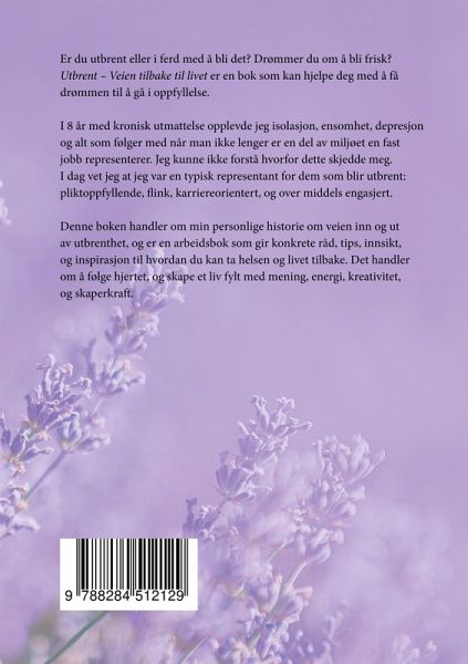 Er du utbrent eller i ferd med å bli det? Drømmer du om å bli frisk? Utbrent - Veien tilbake til livet er en bok som kan hjelpe deg med å få drømmen til å gå i oppfyllelse. I 8 år med kronisk utmattelse opplevde jeg isolasjon, ensomhet, depresjon og alt som følger med når man ikke lenger er en del av miljøet en fast jobb representerer. Jeg kunne ikke forstå hvorfor dette skjedde meg. I dag vet jeg at jeg var en typisk representant for dem som blir utbrent: pliktoppfyllende, flink, karriereorientert, og over middels engasjert. Denne boken handler om min personlige historie om veien inn og ut av utbrenthet, og er en arbeidsbok som gir konkrete råd, tips, innsikt, og inspirasjon til hvordan du kan ta helsen og livet tilbake. Det handler om å følge hjertet, og skape et liv fylt med mening, energi, kreativitet, og skaperkraft.