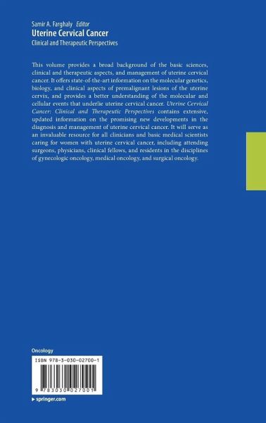 Epidemiology of Cervical Cancer.- Prevention of Cervical Cancer.- Current Advances in Optical Screening for Cervical Cancer.- Cervical Cancer Screening in Low and Middle Income Countries.- Pathology and Molecular Diagnosis of Cervical Cancer and Precursor Lesions.- Uterine Cervical Cancer in Woman with HIV Infection.- Immunotherapy for Pre-Cancerous Lesions of the Uterine Cervix.- Utility of Sentinel Node Biopsy in Cervical Cancer.- Fertility Sparing Surgery for Early Stage Uterine Cervical Cancer.- Standard and Novel Surgical Treatments in Cervical Cancer. Management of Recurrent Uterine Cervical Cancer.- Chemotherapy for Cervical Cancer.- Potential Biomarkers for Personalized Radiation Therapy for Patients with Uterine Cervical Cancer.- Radiotherapy for Uterine Cervical Cancer.- Quality of Life in Woman with Cervical Cancer.- Index.