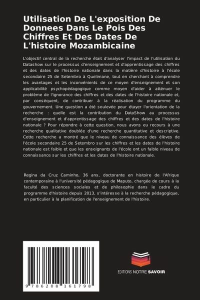 L'objectif central de la recherche était d'analyser l'impact de l'utilisation du Datashow sur le processus d'enseignement et d'apprentissage des chiffres et des dates de l'histoire nationale dans la matière d'histoire à l'école secondaire 25 de Setembro à Quelimane, tout en cherchant à comprendre les avantages et les inconvénients de ce moyen d'enseignement et son applicabilité psychopédagogique comme moyen d'aider à atténuer le problème de l'ignorance des chiffres et des dates de l'histoire nationale et, par conséquent, de contribuer à la réalisation du programme du gouvernement. Une question a été soulevée pour étayer l'orientation de la recherche : quelle est la contribution du DataShow au processus d'enseignement et d'apprentissage des chiffres et des dates de l'histoire nationale ? Pour répondre à cette question, nous avons eu recours à une recherche qualitative doublée d'une recherche quantitative et descriptive. Cette recherche a montré que le niveau de connaissance des élèves de l'école secondaire 25 de Setembro sur les chiffres et les dates de l'histoire nationale est faible et que les enseignants de l'école ont un faible niveau de connaissance sur les chiffres et les dates de l'histoire nationale.