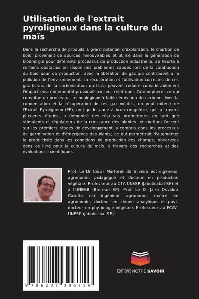 Dans la recherche de produits à grand potentiel d'exploration, le charbon de bois, provenant de sources renouvelables et utilisé dans la génération de bioénergie pour différents processus de production industrielle, se heurte à certains obstacles en raison des problèmes causés lors de la combustion du bois pour sa production, avec la libération de gaz qui contribuent à la pollution de l'environnement. La récupération et l'utilisation correctes de ces gaz (issus de la carbonisation du bois) peuvent réduire considérablement l'impact environnemental provoqué par leur rejet dans l'atmosphère, ce qui constitue un processus technologique à faible émission de carbone. Avec la condensation et la récupération de ces gaz volatils, on peut obtenir de l'Extrait Pyroligneux (EP), un liquide jaune à brun rougeâtre, qui, à travers plusieurs études, a démontré des résultats prometteurs en tant que stimulants et régulateurs de la croissance des plantes, en mettant l'accent sur les premiers stades de développement. y compris dans les processus de germination et d'émergence des plants, ce qui permettrait d'augmenter la productivité dans les conditions de production des champs, observées dans ce livre pour la culture du maïs, à travers des recherches et des évaluations scientifiques.