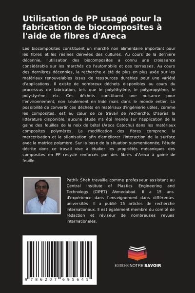 Les biocomposites constituent un marché non alimentaire important pour les fibres et les résines dérivées des cultures. Au cours de la dernière décennie, l'utilisation des biocomposites a connu une croissance considérable sur les marchés de l'automobile et des terrasses. Au cours des dernières décennies, la recherche a été de plus en plus axée sur les matériaux renouvelables issus de ressources durables pour une variété d'applications. Il existe de nombreux déchets disponibles au cours du processus de fabrication, tels que le polyéthylène, le polypropylène, le polystyrène, etc. Ces déchets constituent une nuisance pour l'environnement, non seulement en Inde mais dans le monde entier. La possibilité de convertir ces déchets en matériaux d'ingénierie utiles, comme les composites, est au coeur de ce travail de recherche. D'après la littérature disponible, aucune étude n'a été menée sur l'application de la gaine des feuilles de la noix de bétel (Areca Catechu) dans les matériaux composites polymères. La modification des fibres comprend la mercerisation et la silanisation afin d'améliorer l'interaction de la surface avec la matrice polymère. Sur la base de la situation susmentionnée, l'étude décrite dans ce travail vise à étudier les propriétés mécaniques des composites en PP recyclé renforcés par des fibres d'Areca à gaine de feuille.