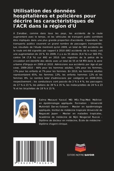 À Zanzibar, comme dans tous les pays, les accidents de la route augmentent avec le temps, et les véhicules de transport public semblent être impliqués dans une plus grande proportion d'accidents. Cependant, les transports publics couvrent un grand nombre de passagers transportés. Les résultats de l'étude montrent qu'en 2009, un total de 583 accidents de la route ont été signalés par rapport à 2010 (692 accidents de la route), soit une augmentation de 19 %. En 2009, il y a eu 55 décès (9,4 %) sur 583 ITG, contre 54 (7,8 %) sur 692 en 2010. Les registres de la police de la circulation ont identifié des décès avec un total de 55 et 54 RTA dans la zone urbaine d'Unguja en 2009 et 2010. Admissions aux accidents par âge et par sexe, 2009-2010 - 66% pour les hommes adultes, 10% pour les femmes, 17% pour les enfants et 7% pour les femmes. En 2010, les hommes adultes représentaient 65%, les femmes 13%, les enfants hommes 12% et les femmes 8%. Le nombre total d'admissions par catégorie en 2009-2010, respectivement : les conducteurs sont passés de 3 % à 4 %, les passagers de 17 % à 23 %, les piétons de 39 % à 35 %, les motocyclettes de 24 % à 23 % et les bicyclettes de 18 % à 15 %.