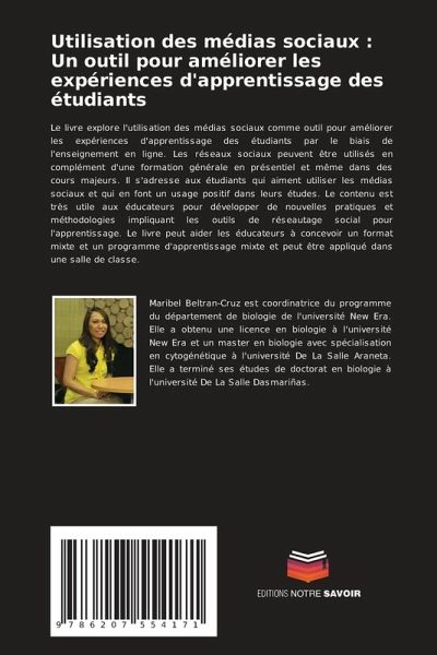 Le livre explore l'utilisation des médias sociaux comme outil pour améliorer les expériences d'apprentissage des étudiants par le biais de l'enseignement en ligne. Les réseaux sociaux peuvent être utilisés en complément d'une formation générale en présentiel et même dans des cours majeurs. Il s'adresse aux étudiants qui aiment utiliser les médias sociaux et qui en font un usage positif dans leurs études. Le contenu est très utile aux éducateurs pour développer de nouvelles pratiques et méthodologies impliquant les outils de réseautage social pour l'apprentissage. Le livre peut aider les éducateurs à concevoir un format mixte et un programme d'apprentissage mixte et peut être appliqué dans une salle de classe.