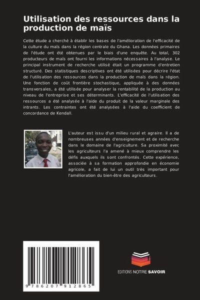 Cette étude a cherché à établir les bases de l'amélioration de l'efficacité de la culture du maïs dans la région centrale du Ghana. Les données primaires de l'étude ont été obtenues par le biais d'une enquête. Au total, 302 producteurs de maïs ont fourni les informations nécessaires à l'analyse. Le principal instrument de recherche utilisé était un programme d'entretien structuré. Des statistiques descriptives ont été utilisées pour décrire l'état de l'utilisation des ressources dans la production de maïs dans la région. Une fonction de coût frontière stochastique, appliquée à des données transversales, a été utilisée pour analyser la rentabilité de la production au niveau de l'entreprise et ses déterminants. L'efficacité de l'utilisation des ressources a été analysée à l'aide du produit de la valeur marginale des intrants. Les contraintes ont été analysées à l'aide du coefficient de concordance de Kendall.