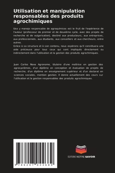 Uso y manejo responsable de agroquímicos est le fruit de l'expérience de l'auteur (professeur de premier et de deuxième cycle, avec des projets de recherche et de vulgarisation), destiné aux producteurs, aux entreprises, aux professionnels, aux étudiants, aux conseillers et aux chercheurs, entre autres.Grâce à sa structure et à son contenu, nous espérons qu'il constituera une aide précieuse pour tous ceux qui sont impliqués directement ou indirectement dans l'utilisation et la gestion des produits agrochimiques.