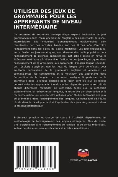 Ce document de recherche monographique explore l'utilisation de jeux grammaticaux dans l'enseignement de l'anglais à des apprenants de niveau intermédiaire. Les méthodes d'enseignement traditionnelles sont remplacées par des activités basées sur des tâches afin d'accroître l'engagement dans les salles de classe modernes. Les jeux linguistiques, en particulier les jeux numériques, sont devenus des outils populaires pour l'enseignement de diverses compétences. Cet article passe en revue la littérature antérieure afin d'examiner l'efficacité des jeux linguistiques dans l'enseignement de la grammaire aux apprenants d'anglais langue seconde. Les résultats suggèrent que les jeux de langue sont bénéfiques pour améliorer l'acquisition de la grammaire anglaise et améliorer les connaissances, les compétences et la motivation des apprenants dans l'acquisition de la langue. Le document souligne l'importance de la grammaire dans la langue anglaise et la façon dont les jeux de langue peuvent aider les apprenants à maîtriser les règles de grammaire. L'étude aborde différentes méthodes de recherche, telles que la recherche expérimentale, la recherche par enquête, la recherche par observation et la recherche-action, qui peuvent être utilisées pour étudier l'efficacité des jeux de grammaire dans l'enseignement des langues. La nouveauté de l'étude réside dans le développement et l'application des jeux de grammaire dans la pratique pédagogique.