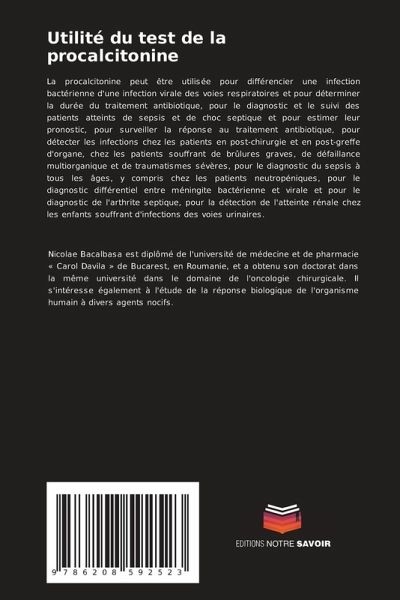 La procalcitonine peut être utilisée pour différencier une infection bactérienne d'une infection virale des voies respiratoires et pour déterminer la durée du traitement antibiotique, pour le diagnostic et le suivi des patients atteints de sepsis et de choc septique et pour estimer leur pronostic, pour surveiller la réponse au traitement antibiotique, pour détecter les infections chez les patients en post-chirurgie et en post-greffe d'organe, chez les patients souffrant de brûlures graves, de défaillance multiorganique et de traumatismes sévères, pour le diagnostic du sepsis à tous les âges, y compris chez les patients neutropéniques, pour le diagnostic différentiel entre méningite bactérienne et virale et pour le diagnostic de l'arthrite septique, pour la détection de l'atteinte rénale chez les enfants souffrant d'infections des voies urinaires.
