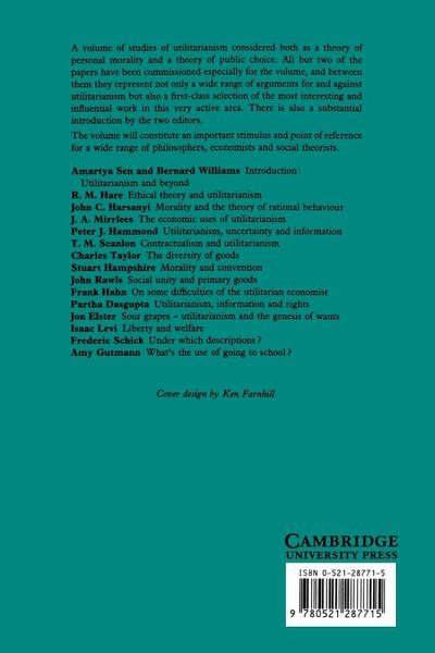 Preface; Introduction: utilitarianism and beyond Amartya Sen and Bernard Williams; 1. Ethical theory and utilitarianism R. M. Hare; 2. Morality and the theory of rational behaviour John C. Harsanyi; 3. The economic uses of utilitarianism J. A. Mirrlees; 4. Utilitarianism, uncertainty and information Peter J. Hammond; 5. Contractualism and utilitarianism T. M. Scanlon; 6. The diversity of goods Charles Taylor; 7. Morality and convention Stuart Hampshire; 8. Social unity and primary goods John Rawls; 9. On some difficulties of the utilitarian economist Frank Hahn; 10. Utilitarianism, information and rights Partha Dasgupta; 11. Sour grapes - utilitarianism and the genesis of wants Jon Elster; 12. Liberty and welfare Isaac Levi; 13. Under which descriptions? Frederic Schick; 14. What's the use of going to school? Amy Gutmann; Bibliography.