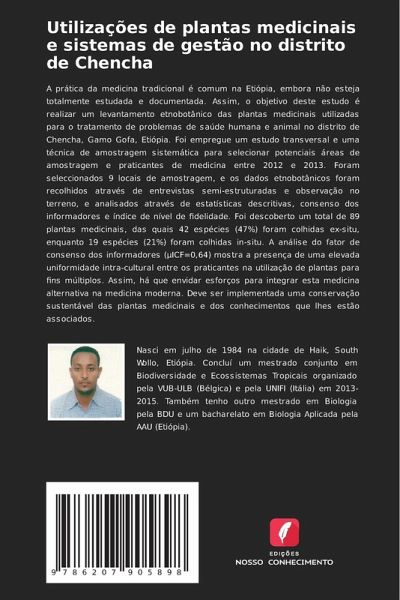 A prática da medicina tradicional é comum na Etiópia, embora não esteja totalmente estudada e documentada. Assim, o objetivo deste estudo é realizar um levantamento etnobotânico das plantas medicinais utilizadas para o tratamento de problemas de saúde humana e animal no distrito de Chencha, Gamo Gofa, Etiópia. Foi empregue um estudo transversal e uma técnica de amostragem sistemática para selecionar potenciais áreas de amostragem e praticantes de medicina entre 2012 e 2013. Foram seleccionados 9 locais de amostragem, e os dados etnobotânicos foram recolhidos através de entrevistas semi-estruturadas e observação no terreno, e analisados através de estatísticas descritivas, consenso dos informadores e índice de nível de fidelidade. Foi descoberto um total de 89 plantas medicinais, das quais 42 espécies (47%) foram colhidas ex-situ, enquanto 19 espécies (21%) foram colhidas in-situ. A análise do fator de consenso dos informadores (¿ICF=0,64) mostra a presença de uma elevada uniformidade intra-cultural entre os praticantes na utilização de plantas para fins múltiplos. Assim, há que envidar esforços para integrar esta medicina alternativa na medicina moderna. Deve ser implementada uma conservação sustentável das plantas medicinais e dos conhecimentos que lhes estão associados.