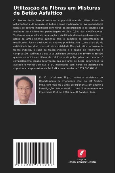 O objetivo deste livro é examinar a possibilidade de utilizar fibras de polipropileno e de celulose no betume como modificadores. As propriedades físicas do betume modificado com fibras de polipropileno e de celulose são avaliadas para diferentes percentagens (0,1% a 0,5%) dos modificadores. Verifica-se que o valor de penetração e ductilidade diminui gradualmente e o ponto de amolecimento aumenta com o aumento da percentagem do modificador. Foram avaliados os ensaios primários, tais como o ensaio de estabilidade Marshall, o ensaio de estabilidade Marshall retida, o ensaio de tração indireta, o rácio de tração indireta e o ensaio de resistência à compressão. Verificou-se que a estabilidade aumenta em 30,68% e 39,82% quando se adicionam fibras de celulose e de polipropileno ao betume. O comportamento tensão-deformação das misturas de betão betuminoso foi avaliado e verificou-se que o BC modificado com fibras de polipropileno suportou a carga máxima de 74,8 KN a uma tensão de 1879,396 KN/m².