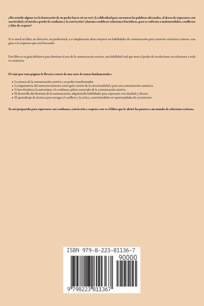 ¿Ha sentido alguna vez la frustración de no poder hacer oír su voz? ¿La dificultad para encontrar las palabras adecuadas, el deseo de expresarse con asertividad y el miedo a perder la confianza y la convicción? ¿Intenta establecer relaciones fructíferas, pero se enfrenta a malentendidos, conflictos y falta de respeto? Si es usted un líder, un directivo, un profesional, o si simplemente desea mejorar sus habilidades de comunicación para construir relaciones exitosas, esta guía es la respuesta que está buscando. Este libro es tu guía definitiva para dominar el arte de la comunicación asertiva, una habilidad vital que tiene el poder de revolucionar tus relaciones y toda tu existencia. El viaje por estas páginas le llevará a través de una serie de temas fundamentales:La esencia de la comunicación asertiva y su poder transformador. La importancia del autoconocimiento como guía a través de la emocionalidad y para una comunicación auténtica. Cómo fortalecer la autoestima y la confianza, pilares esenciales de la comunicación asertiva. El desarrollo del dominio de la comunicación, adquiriendo habilidades para expresarse con claridad y eficacia. El aprendizaje de técnicas para navegar el conflicto y la crítica, convirtiéndolos en oportunidades de crecimiento. Si está preparado para expresarse con confianza, convicción y respeto, este es el libro que le abrirá las puertas a un mundo de relaciones exitosas.