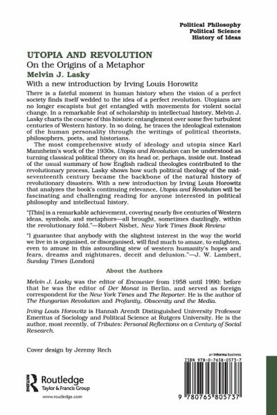The most comprehensive study of ideology and utopia since Karl Mannheim's work of the 1930s, Utopia and Revolution can be understood as turning classical political theory on its head or, perhaps, inside out. Instead of the usual summary of how English radical theologies contributed to the revolutionary process, Lasky shows how such political theology of the mid-seventeenth century became the backbone of the natural history of revolutionary disasters. In a remarkable feat of scholarship in intellectual history, Lasky charts the course of this historic entanglement over some five turbulent centuries of Western history. In so doing, he traces the ideological extension of the human personality through the writings of political theorists, philosophers, poets, and historians.