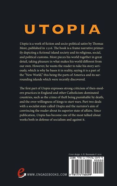 Utopia is a work of fiction and socio-political satire by Thomas More, published in 1516. The book is a frame narrative primarily depicting a fictional island society and its religious, social, and political customs. More pieces his world together in great detail, taking pleasure in what makes his world different from our own. However, he wants the reader to take his story seriously, which is why he bases it in reality, saying it is a part of the "New World," this being the parts of America and its surrounding islands which were recently discovered. The first part of Utopia expresses strong…mehr
