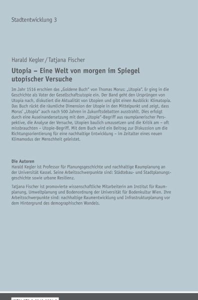 Im Jahr 1516 erschien das «Goldene Buch» von Thomas Morus: «Utopia». Er ging in die Geschichte als Vater der Gesellschaftsutopie ein. Der Band geht den Ursprüngen von Utopia nach, diskutiert die Aktualität von Utopien und gibt einen Ausblick: Klimatopia. Das Buch rückt die räumliche Dimension der Utopie in den Mittelpunkt und zeigt, dass Morus «Utopia» auch nach 500 Jahren in Zukunftsdebatten ausstrahlt. Dies erfolgt durch eine Auseinandersetzung mit dem «Utopie»-Begriff aus raumplanerischer Perspektive, die Analyse der Versuche, Utopien baulich umzusetzen und die Kritik am - oft missbrauchten - Utopie-Begriff. Mit dem Buch wird ein Beitrag zur Diskussion um die Richtungsorientierung für eine nachhaltige Entwicklung - im Zeitalter eines neuen Klimamodus der Menschheit geleistet.
