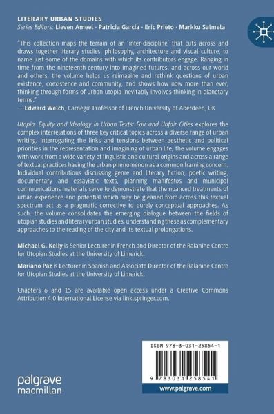 Utopia, Equity and Ideology in Urban Texts: Fair and Unfair Cities explores the complex interrelations of three key critical topics across a diverse range of urban writing. Interrogating the links and tensions between aesthetic and political priorities in the representation and imagining of urban life, the volume engages with work from a wide variety of linguistic and cultural origins and across a range of textual practices having the urban phenomenon as a common framing concern. Individual contributions discussing genre and literary fiction, poetic writing, documentary and essayistic texts, planning manifestos and municipal communications materials serve to demonstrate that the nuanced treatments of urban experience and potential which may be gleaned from across this textual spectrum act as a pragmatic corrective to purely conceptual approaches. As such, the volume consolidates the emerging dialogue between the fields of utopian studies and literary urban studies, understanding these as complementary approaches to the reading of the city and its textual prolongations.