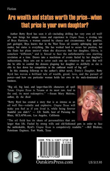 Are wealth and status worth the price-when that price is your own daughter? Author Betty Byrd has seen it all-including drilling her very own oil well! She now brings her unique vision and experience to Utopia Texas, a riveting tale of Brya Harrison, a woman created by chance and circumstance. Part gambler, part geologist, Brya knows that in the West Texas oil country upbringing may not matter, but status is everything. She has worked hard to secure her position, but she finds her plans unravel when she discovers that her daughter, Olivia, is somehow "different," and is forced to face the unfathomable-one startling revelation at a time. Drawn into a maelstrom of events fueled by her daughter's indiscretions, Brya sets out to cover each one up-whatever the cost. But will she be able to combat the demons plaguing her daughter as skillfully as she is able to face down her competition in the cutthroat world of big oil? In this stunning follow-up to the author's debut novel, Trinity's Daughter, Betty Byrd has woven a brilliant tale of wealth, greed, love, and the pursuit of power-and how one particular woman holds her own in the male-dominated oil business. "Big oil, big land, and larger-than-life characters all spell Texas. Utopia Texas is Texana at its most raw. And in the end, its most redemptive." -Susan Mary Malone, author, By the Book "Betty Byrd has created a story that is as intense as an oil well fire-volatile and explosive. Utopia Texas will make you feel as if you lived it, while being forever thankful you didn't." - J.D. Smith, host of Pursuing the Blues, KCLAFM.com, Los Angeles, California "The oil field has its share of personalities that are larger than life. Fueled by strong wills and old-fashioned guts in order to face the unthinkable, Byrd's Utopia Texas is compulsively readable." -Bill Bledsoe, Petroleum Engineer, Fort Worth, Texas