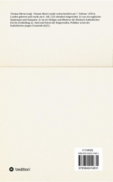 Thomas Morus (engl. Thomas More) wurde wahrscheinlich am 7. Februar 1478 in London geboren und wurde am 6. Juli 1535 ebendort hingerichtet. Er war ein englischer Staatsmann und Humanist. Er ist ein Heiliger und Märtyrer der Römisch-Katholischen Kirche (Gedenktag 22. Juni) und Patron der Regierenden, Politiker sowie der Katholischen jungen Gemeinde (KjG).