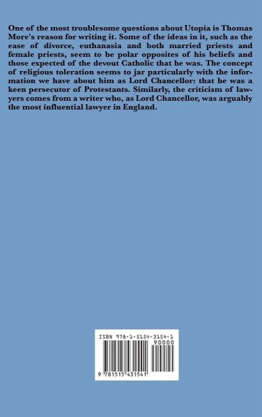 One of the most troublesome questions about Utopia is Thomas More's reason for writing it. Some of the ideas in it, such as the ease of divorce, euthanasia and both married priests and female priests, seem to be polar opposites of his beliefs and those expected of the devout Catholic that he was. The concept of religious toleration seems to jar particularly with the information we have about him as Lord Chancellor: that he was a keen persecutor of Protestants