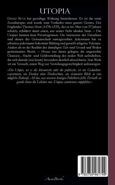 Neu lektorierte 2020er-Ausgabe, mit modernisierter Rechtschreibung und einem aktuellen Vorwort des Herausgebers Dieses Buch hat gewaltige Wirkung hinterlassen. Es ist die erste »Sozialutopie«, und wurde zum Vorläufer eines ganzes Genres. Der Engländer Thomas More (1478-1535), der es im Alter von 37 Jahren schrieb, schildert darin einen, aus seiner Sicht idealen Staat. - Die Utopier kennen kein Privateigentum. Die Interessen des einzelnen sind denen der Gemeinschaft untergeordnet. Jedermann hat zu arbeiten; jedermann bekommt Bildung und genießt religiöse Toleranz. Anders als in der Realität der damaligen Zeit sind Grund und Boden gemeinsamer Besitz. - Morus' Werk ist ein Versuch, einen Weg zur Verteilungsgerechtigkeit aufzuzeigen. »Die Utopie, sei es die literarische oder die politische, ist ein Gedankenexperiment, ein Denken ohne Denkverbote, ein visionärer Blick in eine mögliche Zukunft. All das, was unseren heutigen Politikern fehlt. Deshalb sei gerade ihnen die Lektüre vonUtopia wärmstens empfohlen.«