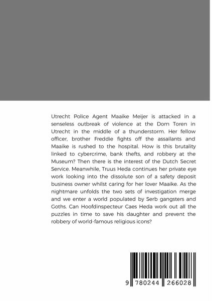 Maaike is attacked in a vicious assault that links a computer genius, bank robberies, Goths, Serbs and religious icons. Hoofdinspecteur Caes Heda and his team fight crime in one direction whilst his daughter goes the opposite route until their worlds collide in murder and mayhem. The mental anguish Maaike is under bleeds to the surface at the novels denouement.