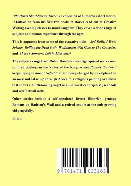 Utta Drivel Short Stories Three is a collection of humorous short stories. It follows on from his first two books of stories read out at Creative Writing evening classes to much laughter. They cover a wide range of subjects and human experience through the ages. This is apparent from some of the evocative titles: Sod Dolly, I Want Jolene; Boiling the Dead Owl; Walfumstow Will Goes to The Crusades; and There's Someone Left in Midsomer! The subjects range from Robin Hoodie's downright-pissed merry men to hired donkeys in the Valley of the Kings where Ramses the Great keeps trying to mount Nefertiti. From being charged by an elephant on an overland safari up through Africa to a religious painting in Bolivia that shows a butch-looking angel in all-in wrestler turquoise jackboots and red football socks. Other stories include a self-appointed Breast Historian, grumpy Romans on Hadrian's Wall and a retired couple at the pub growing old grapefully. Enjoy...