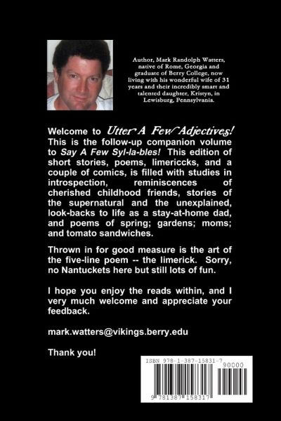 The follow-up companion volume to Say A Few Syl-la-bles!, Utter A Few Adjectives! is a compilation of short stories, poems, limericks, and comics. This delightfully insightful collection contains introspective studies, stories of the supernatural and the unexplained, reminiscences of a cherished childhood friend, recollections of the author's stay-at-home-dad experiences, the art of the five-line poem, and even offers experiments in stick-man comickery. Sure to please any reader. Enjoy!