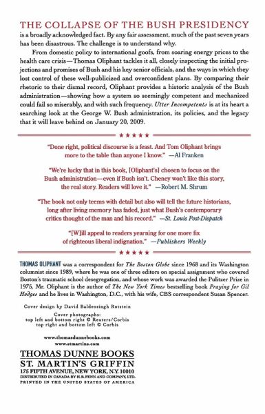 "Tom Oliphant is one of the true chroniclers of America. He uses his wit and wisdom to offer critical, insightful, and loving observations of our politics, culture, and society. He is the Will Rogers of our time." ---Madeleine Albright The collapse of the Bush presidency is a broadly acknowledged fact. By any fair assessment, much of the past seven years has been disastrous. The challenge is to understand why. From domestic policy to international goofs, from soaring energy prices to the health care crisis---Thomas Oliphant tackles it all, closely inspecting the initial projections and promises of Bush and his key senior of?cials, and the ways in which they lost control of these well-publicized and overcon?dent plans. By comparing their rhetoric to their dismal record, Oliphant provides a historic analysis of the Bush administration---showing how a system so seemingly competent and mechanized could fail so miserably, and with such frequency. Utter Incompetents is at its heart a searching look at the George W. Bush administration, its policies, and the legacy that it will leave behind on January 20, 2009.