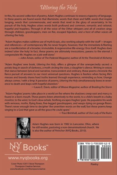 In this, his second collection of poetry, Adam Hughes continues to weave a tapestry of language. In these poems are found words that illuminate, words that cheer and fulfill, words that inspire longing, words that commemorate, and words that revel in the glory of uncertainty. In his pursuit of the holy, Hughes utters words both profound and common, romantic and rational, hopeful and hopeless. Through it all the voice of the Other whispers and all of creation sings through children, grasshoppers, men on fire, escaped hijackers, and a host of other voices all uttering the holy.