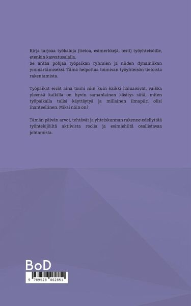 Kirja tarjoaa työkaluja (tietoa, esimerkkejä, testi) työyhteisöille, etenkin kasvatusalalla. Se antaa pohjaa työpaikan ryhmien toimivuuden ja niiden dynamiikan ymmärtämiseksi. Tämä helpottaa hyvän työyhteisön ohjattua rakentamista. Työpaikat eivät aina toimi niin kuin kaikki haluaisivat, vaikka yleensä kaikilla on hyvin samanlainen käsitys siitä, miten työpaikalla tulisi käyttäytyä ja millainen ilmapiiri olisi ihanteellinen. Miksi näin on? "Vanhan hyvän ajan yhteisöllisyys" eli luontainen yhteen kasvaminen ei enää toteudu tässä ajassa. Tämän päivän arvot, tehtävät ja yhteiskunnan rakenne edellyttää työntekijöiltä aktiivista roolia ja esimiehiltä osallistavaa johtamista. Tämä on suositun kirjan 3.painos Kirjoittaja Liisa Raina ent. Kiesiläinen (FM, psykologi) on kokenut yhteisökouluttaja. Hän on kirjoittanut useita alansa tietokirjoja.