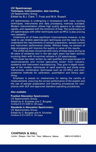 Contributors. Preface. Principles of spectrophotometric measurements with particular reference to the UV visible region D Thorburn Burns; Instrumentation of UV visible spectroscopy J N Miller; Standards for UV spectroscopy M A Russell; Spectroscopic multicomponent analysis R L Tranter and B Davies; UV visible spectroscopic libraries B Davies; Spectra structure correlation T L Threlfall; Colour L Threlfall; UV detection in high performance liquid chromatography B J Clark; Assessing the validity of spectroscopic information C Burgess; Practical experiments T Frost and R L Tranter; Index.