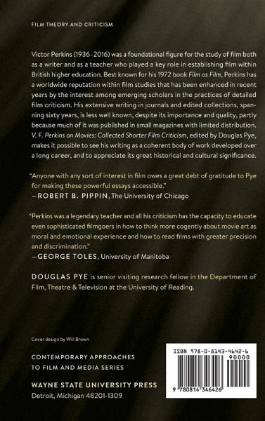 Victor Perkins (1936-2016) was a foundational figure for the study of film both as a writer and as an educationalist and teacher who played a key role in establishing film within British higher education. Best known for his 1972 book Film as Film, Perkins has a worldwide reputation within film studies that has been enhanced in recent years by the interest among emerging scholars in the practices of detailed film criticism. His extensive writing in journals and edited collections, spanning sixty years, is less well known, despite its importance and quality, partly because much of it was published in small magazines with limited distribution. V. F. Perkins on Movies Collected Shorter Film Criticism, edited by Douglas Pye, makes it possible to see his writing as a coherent body of work, developed over a long career, and to appreciate its great historical and cultural significance. Part 1 of the book covers Perkins's early articles from 1960 to 1972, showing the emergence of ways of thinking about criticism and movies that remained constant throughout his career. Perkins was one of a small group of British writers who pioneered the serious and systematic discussion of Hollywood cinema. Beginning at the University of Oxford in the pages of Oxford Opinion, and then in Movie, the journal they established in 1962, these writers mounted a sustained critique of established writing on film, arguing for a criticism rooted in the detailed decisions that make up the complex texture of a film. The work Perkins published in the 1980s and beyond, which makes up part 2 of this volume, was resolute in upholding his critical values. It elaborated his approach in studies of individual movies and their makers and also reflected on major critical and conceptual issues, while maintaining his lifelong commitment to writing accessibly in ordinary language. V. F. Perkins on Movies gives unimpeded access to one of the most distinctive and distinguished of critical voices and will be widely welcomed by academics, students of film, and informed film enthusiasts.
