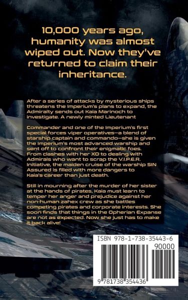 10,000 years ago, humanity was almost wiped out. Now they've returned to claim their inheritance. After a series of attacks by mysterious ships threatens the Imperium's plans to expand, the Admiralty sends out Kaia Marinoch to investigate. A newly minted Lieutenant Commander and one of the Imperium's first special forces Viper operatives-a blend of starship captain and commando-she is given the Imperium's most advanced warship and sent off to confront their enigmatic foes. From clashes with her XO to dealing with Admirals who want to scrap the V.I.P.E.R. Initiative, the maiden cruise of the warship SIN Assured is filled with more dangers to Kaia's career than just death. Still in mourning after the murder of her sister at the hands of pirates, Kaia must learn to temper her anger and prejudice against her non-Human Zahex crew as she battles competing pirates and corporate interests. She soon finds that things in the Opherian Expanse are not as expected. Now she just has to make it back alive!