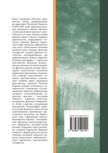 Kniga posvjashhena sobytijam grazhdanskoj vojny, razvernuvshimsja na territorii Rossijskoj Karelii. V 1918-1922 godah karel'skie regiony nahodilis' v fokuse protivostojanija razlichnyh voennyh i politicheskih sil: zdes' voevali otrjady Krasnoj armii i belogo Severnogo pravitel'stva, podrazdelenija Antanty i krasnyh finnov, karel'skij otrjad i finskie dobrovol'cheskie chasti. Znachitel'noe vnimanie udeljaetsja roli molodogo finskogo gosudarstva i gruppy finskih aktivistov, inspirirovavshih tri dobrovol'cheskih pohoda v Kareliju. V centre monografii - karel'skoe krest'janstvo. Ispol'zuja neizvestnye rossijskomu chitatelju materialy finskih arhivov, avtory analizirujut politicheskuju psihologiju karel'skogo krest'janina, okazavshegosja v centre ozhestochjonnogo voennogo protivostojanija, i pokazyvajut naibolee jarkie projavlenija krest'janskih strategij. Chitatel' vpervye poluchaet vozmozhnost' poznakomit'sja s raportami i vospominanijami finskih dobrovol'cev, interv'ju i vospominanijami karel'skih krest'jan ¿ uchastnikov sobytij - i finskih politikov, materialami finskogo General'nogo shtaba i drugimi unikal'nymi dokumentami. V monografii udeljaetsja osoboe vnimanie takim, vsjo eshhjo maloizuchennym projavlenijam krest'janskogo aktivizma, kak Karel'skij polk i Vremennyj Komitet Belomorskoj Karelii, vozglavljavshij karel'skoe kvazigosudarstvennoe obrazovanie na severo-zapade regiona. Otdel'nye glavy posvjashheny sozdaniju Karel'skoj Trudovoj kommuny i Karel'skomu vosstaniju, stavshemu poslednej popytkoj sozdanija nezavisimogo, nebol'shevistskogo karel'skogo nacional'nogo gosudarstva.