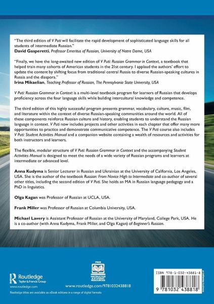 Anna Kudyma is Senior Lecturer in Russian and Ukrainian at the University of California, Los Angeles, USA. She is the author of the textbook Russian: From Novice High to Intermediate and co-author of several other titles, including the second edition of V Puti. She holds an MA in Russian language pedagogy and a PhD in linguistics. Olga Kagan was Professor of Russian at UCLA, USA. Frank Miller was Professor of Russian at Columbia University, USA. Michael Lavery is Assistant Professor of Russian at the University of Maryland, College Park, USA. He is a co-author (with Anna Kudyma, Frank Miller, and Olga Kagan) of Beginner's Russian.