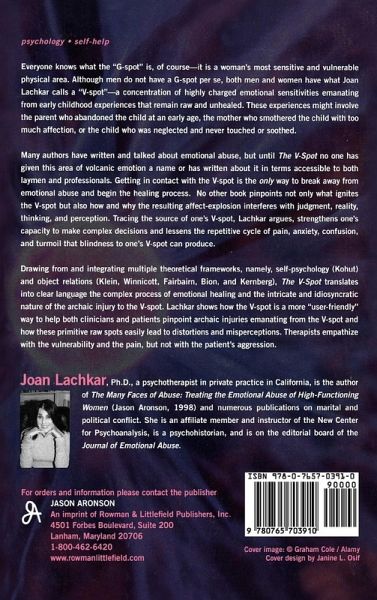 The 'V-Spot' is a term created to describe the most sensitive area of emotional vulnerability that becomes aroused when one partner hits an emotional raw spot in the other. The V Spot is designed to parallel the G-Spot, as the emotional counterpart that can be triggered by a seemingly unimportant event. The V-Spot is comprised of highly charged emotional sensitivities that emanate from raw experiences during infancy and childhood. Getting in contact with the V-Spot is the only way to break away from emotional abuse and begin the healing process. Through Lachkar's book, clinicians and therapists will become acquainted with the V-Spot and recognize the importance of this volatile area of emotional vulnerability.