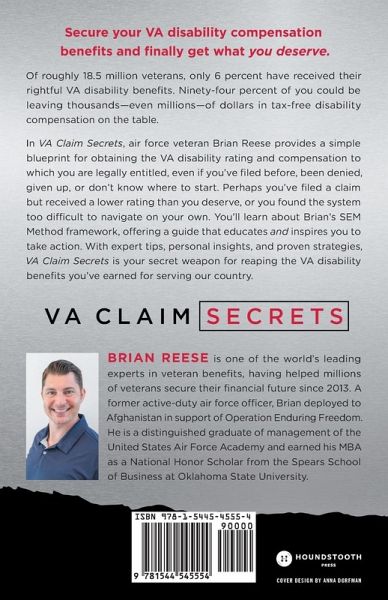 Secure your VA disability compensation benefits and finally get what you deserve. Of roughly 18.5 million veterans, only 6 percent have received their rightful VA disability benefits. Ninety-four percent of you could be leaving thousands-even millions-of dollars in tax-free disability compensation on the table. In VA Claim Secrets, air force veteran Brian Reese provides a simple blueprint for obtaining the VA disability rating and compensation to which you are legally entitled, even if you've filed before, been denied, given up, or don't know where to start. Perhaps you've filed a claim but received a lower rating than you deserve, or you found the system too difficult to navigate on your own. You'll learn about Brian's SEM Method framework, offering a guide that educates and inspires you to take action. With expert tips, personal insights, and proven strategies, VA Claim Secrets is your secret weapon for reaping the VA disability benefits you've earned for serving our country.