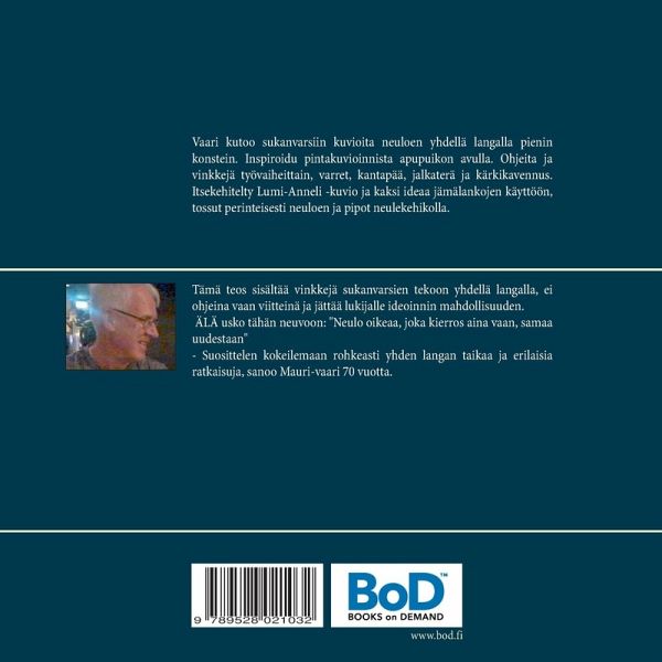 Vaari kutoo sukanvarsiin kuvioita neuloen yhdellä langalla pienin konstein. Inspiroidu pintakuvioinnista apupuikon avulla. Ohjeita ja vinkkejä työvaiheittain, varret, kantapää, jalkaterä ja kärkikavennus. Itsekehitelty Lumi-Anneli -kuvio ja kaksi ideaa jämälankojen käyttöön, tossut perinteisesti neuloen ja pipot neulekehikolla.