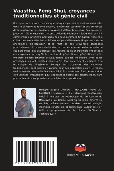 Bien que nous vivions une époque marquée par des inventions colossales dans le domaine de la construction, l'ombre des coutumes et des croyances de la construction est toujours présente à différents niveaux. Ces croyances jouent un rôle majeur dans la construction de bâtiments résidentiels et mini-commerciaux, principalement dans des pays comme le Sri Lanka, l'Inde et la Chine. Une étude détaillée a été menée pour déterminer l'importance de ce phénomène. L'acceptation et le rejet de ces croyances dépendent principalement du niveau d'éducation et de l'expérience professionnelle de ces personnes. Les astrologues, les maçons et les charpentiers ont accepté ces croyances parce qu'ils les héritent de génération en génération et qu'ils ont peur de leur emprise occulte, tandis que les ingénieurs civils et les architectes les ont rejetées parce qu'ils font entièrement confiance à la technologie de l'ingénierie. Lorsque les croyances des coutumes traditionnelles sont prises en compte pour des applications dans le monde réel, la nature rationnelle de celles-ci doit être observée. Elles peuvent alors être utilisées efficacement pour optimiser la qualité des constructions, sans pour autant être supprimées et qualifiées de superstitions.