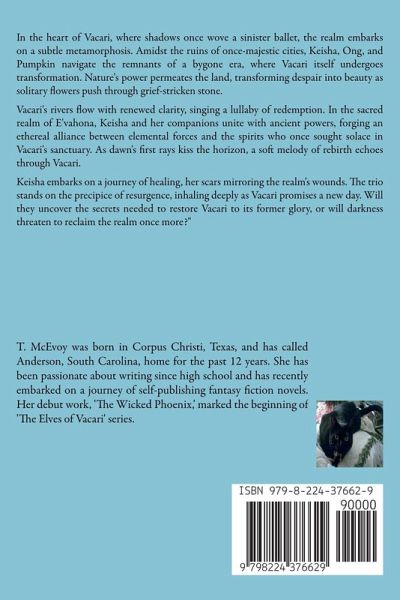 In the heart of Vacari, where shadows once wove a sinister ballet, the realm embarks on a subtle metamorphosis. Amidst the ruins of once-majestic cities, Keisha, Ong, and Pumpkin navigate the remnants of a bygone era, where Vacari itself undergoes transformation. Nature's power permeates the land, transforming despair into beauty as solitary flowers push through grief-stricken stone. Vacari's rivers flow with renewed clarity, singing a lullaby of redemption. In the sacred realm of E'vahona, Keisha and her companions unite with ancient powers, forging an ethereal alliance between elemental forces and the spirits who once sought solace in Vacari's sanctuary. As dawn's first rays kiss the horizon, a soft melody of rebirth echoes through Vacari. Keisha embarks on a journey of healing, her scars mirroring the realm's wounds. The trio stands on the precipice of resurgence, inhaling deeply as Vacari promises a new day. Will they uncover the secrets needed to restore Vacari to its former glory, or will darkness threaten to reclaim the realm once more?" ¿ Reader Praise for T.A. McEvoy "Epic fantasy that sweeps you into another world." "Unforgettable characters and breathtaking lore." Read reviews or leave your own: www.tamcevoy.com/customer-reviews