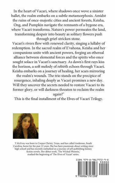 In the heart of Vacari, where shadows once wove a sinister ballet, the realm embarks on a subtle metamorphosis. Amidst the ruins of once-majestic cities and ancient forests, Keisha, Ong, and Pumpkin navigate the remnants of a bygone era, where Vacari transforms. Nature's power permeates the land, transforming despair into beauty as solitary flowers push through grief-stricken stone. Vacari's rivers flow with renewed clarity, singing a lullaby of redemption. In the sacred realm of E'vahona, Keisha and her companions unite with ancient powers, forging an ethereal alliance between elemental forces and the spirits who once sought solace in Vacari's sanctuary. As dawn's first rays kiss the horizon, a soft melody of rebirth echoes through Vacari. Keisha embarks on a journey of healing, her scars mirroring the realm's wounds. The trio stands on the precipice of resurgence, inhaling deeply as Vacari promises a new day. Will they uncover the secrets needed to restore Vacari to its former glory, or will darkness threaten to reclaim the realm again?" This is the final installment of the Elves of Vacari Trilogy.